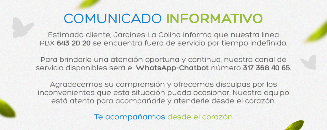 Jardines La Colina se permite informar a la comunidad, clientes y aliados estratégicos que, debido a una situación técnica, nuestra línea PBX (643 20 20)
